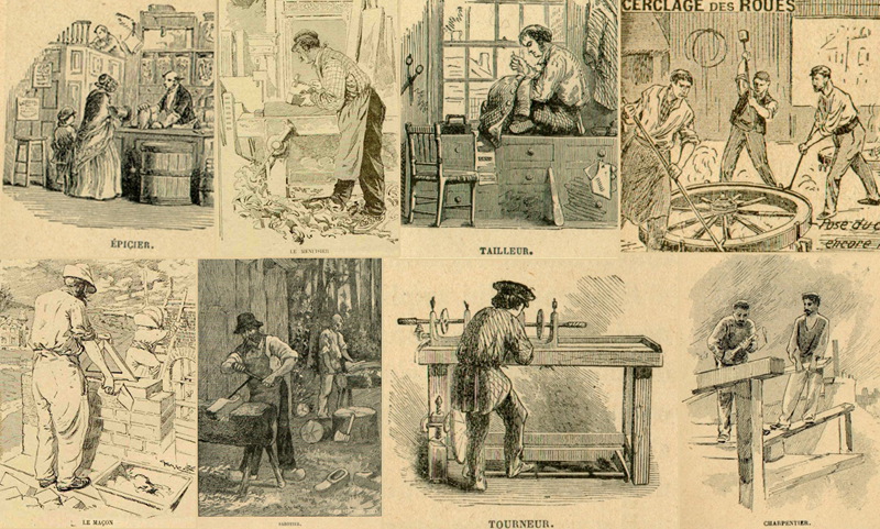 Des métiers d'autrefois existaient au sein de notre commune, tel qu'une marchande de blanc (vendeuse d'outils et ustensiles, souvent ménagers tels que casseroles, bassines, assiettes, lanternes en fer), 4 charrons (fabricant de chars, charrettes, tombereaux, brouettes et autres moyens de transport), 3 maréchales, un cribleur (Fabricant de cribles, et de tamis, pour filtrer la farine des meuniers, ou le sable pour les maçons), 1 bourrelier, 1 blanchisseuse, 2 buandières, 1 sabotier, 1 marchande de sabots.